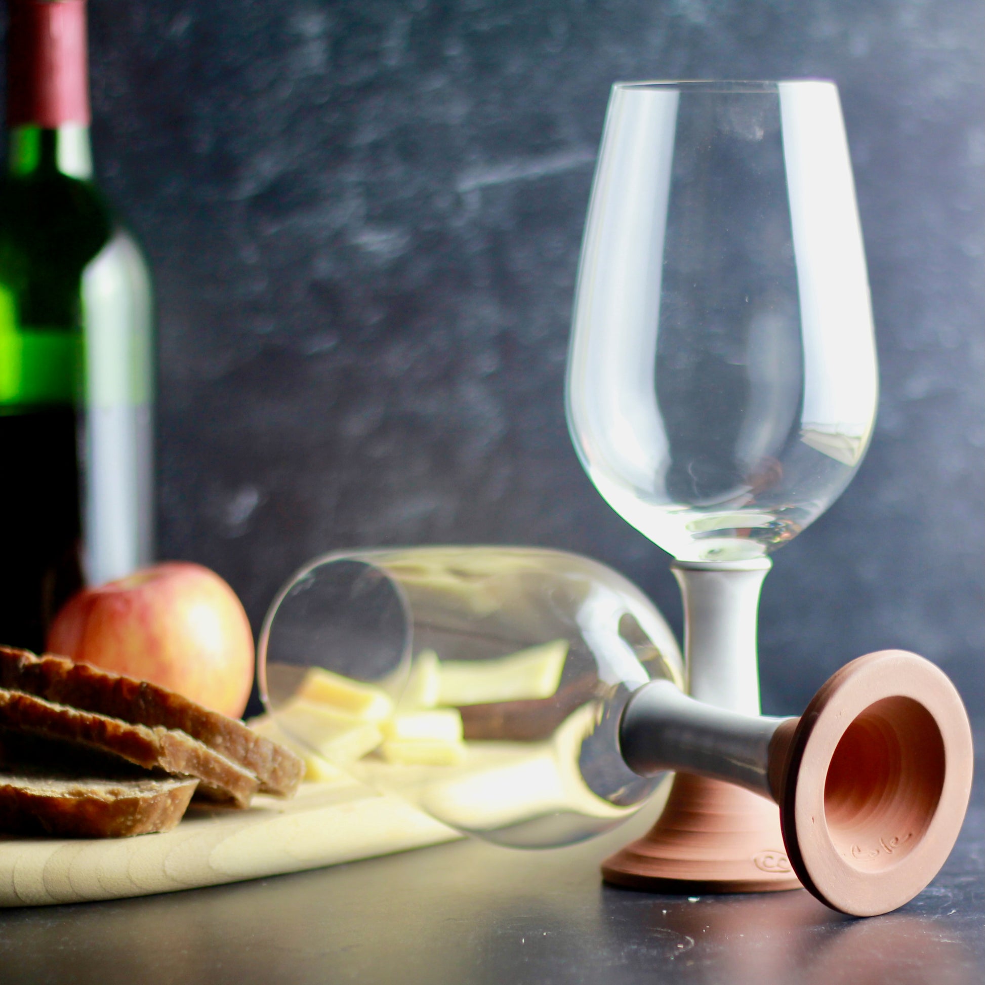 Stoneware that cradles delicate glass. Each wine glass stem is carefully thrown on my pottery wheel. The stem is hollow which creates a sturdy and yet light feel. Once the stoneware is through the glazing process I attach a delicate wine glass to the stem.